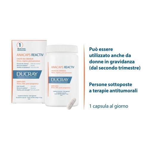 Ducray Anacaps Reactiv è un integratore alimentare specifico per capelli indeboliti da caduta occasionale. La sua formula è pensata per supportare il bulbo pilifero in periodi di particolare stress, stanchezza, squilibri ormonali (come post-partum o allattamento), cambi di stagione o a seguito di terapie farmacologiche intense (inclusi i trattamenti antitumorali). È adatto anche in gravidanza (dal secondo trimestre) e durante l’allattamento. L’associazione mirata di vitamine, ferro e aminoacidi contribuisce al mantenimento della salute del capello e al supporto del metabolismo energetico.