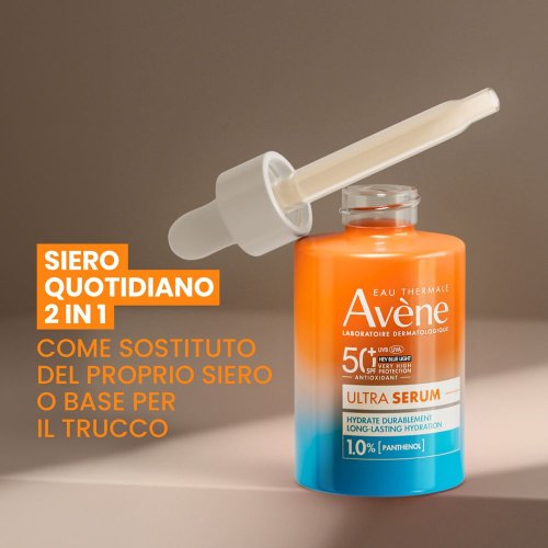 Eau Thermale Avène Ultra Siero SPF50+ è un innovativo trattamento viso 2 in 1 che combina l’efficacia di un siero idratante con una protezione solare molto alta SPF50+. La sua texture ultra leggera si fonde perfettamente con la pelle, garantendo un finish invisibile, non grasso e non appiccicoso, ideale anche come base trucco. Grazie al sistema fotoprotettivo avanzato con tecnologia Triasorb™, offre una protezione globale contro raggi UVB, UVA e luce blu HEV, contribuendo a prevenire il fotoinvecchiamento e i danni cellulari causati dallo stress ossidativo. Arricchito con Pantenolo e un complesso di vitamine antiossidanti, questo siero assicura un’idratazione immediata e a lunga durata, migliorando elasticità e luminosità della pelle giorno dopo giorno. Perfetto per essere integrato nella routine skincare quotidiana, anche per pelli sensibili.