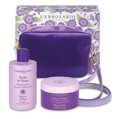La Beauty Bag Grandi Meraviglie Bella di Notte di L’Erbolario è un raffinato cofanetto regalo femminile in edizione limitata, ideale per sorprendere con eleganza e sensualità. Racchiuso in una preziosa pochette viola in tessuto, questo set corpo offre un rituale completo di benessere quotidiano ispirato alle note fiorite e vanigliate della linea Bella di Notte. All’interno della beauty bag si trovano due trattamenti corpo formulati con ingredienti di origine naturale, studiati per detergere, nutrire e profumare la pelle lasciandola morbida, vellutata e intensamente profumata. Un’idea regalo perfetta per ogni occasione speciale, che unisce cura della pelle e charme estetico. Il Bagnoschiuma Bella di Notte deterge delicatamente rispettando l’equilibrio cutaneo, mentre la Crema Profumata per il Corpo idrata e nutre a lungo, avvolgendo la pelle in una fragranza elegante e persistente.