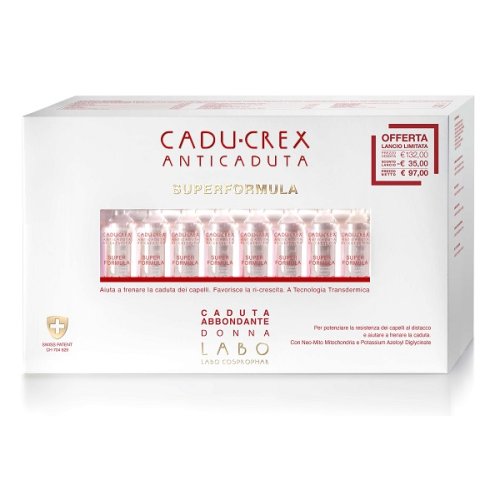 Tutti i preparati in fiale di Labo, dove non specificato diversamente, devono essereutilizzati su cuoio capelluto asciutto e pulito (si consiglia di detergere il cuoiocapelluto con gli Shampoo specifici Cadu-Crex Anticaduta, disponibili in 3 dosaggi). Lefiale Cadu-Crex Anticaduta Superformula contengono 3,5 ml di preparato e sono indicateper un uso quotidiano (5 fiale a settimana con 2 giorni di pausa). Si consiglia untrattamento di almeno due mesi, che può essere ripetuto più volteall'anno.