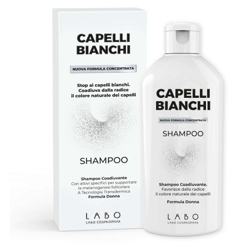 Shampoo specifico per capelli bianchi a base dei principi attivi del trattamentointensivo Capelli Bianchi nuova formula concentrata. I naturali processi di formazionedella melanina possono essere favoriti dagli attivi della nuova formula Capelli Bianchi,brevettata (brevetto svizzero CH 718 031): nonapeptide-23 (Labo NPP-23), sh-polypeptide-4(Labo SHP-4) e palmitoyl tetrapeptide-20 amide (Labo MLN-20). Ad essi si associa il nuovon-acetyl-l-tyrosine(NALT) che, in quanto derivato della tirosina, agisce come precursoredella melanina capillare. La formula, caratterizzata da una specifica base lavante,rappresenta il complemento ideale dei trattamenti topici in fiale o in lozione CapelliBianchi nuova formula concentrata. Nella formula donna sono presenti acido folico eglicoproteine. Non contiene sostanze coloranti.Formula specifica per donna.