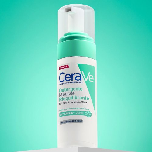 CeraVe Mousse Detergente Riequilibrante è un detergente viso in mousse studiato per pelli sensibili da normali a miste, nato da anni di ricerca dermatologica. La sua formula deterge delicatamente la pelle, idrata a lungo e aiuta a controllare la lucidità, favorendo il ripristino della barriera cutanea. Grazie all’innovativa Tecnologia Detergente Glycolysine™, associata a 3 Ceramidi Essenziali, Niacinamide e Allantoina, questa mousse riequilibra la pelle offrendo fino a 8 ore di controllo della lucidità e 24 ore di idratazione. Agisce in modo mirato: riduce il sebo in eccesso nelle zone più grasse, prolunga l’idratazione nelle aree secche e riduce il rossore, lasciando la pelle pulita, fresca e dall’aspetto sano. La formula è senza profumo, ipoallergenica e non comedogenica, ideale anche per le pelli più delicate. Rimuove efficacemente SPF, makeup e particelle di inquinamento, rendendola perfetta per l’uso quotidiano.