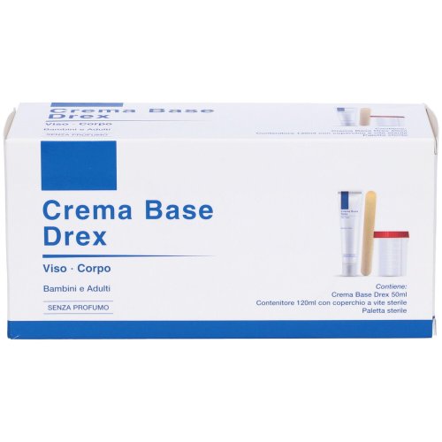 Crema Base Drex 50 ml è un'emulsione umettante ed emolliente specificamente formulata per il trattamento quotidiano della pelle secca o molto secca, sia di adulti che di bambini. Grazie alla sua formula delicata, è ideale per l'applicazione su viso e corpo, anche in caso di pelle sensibilizzata da condizioni dermatologiche o trattamenti farmacologici. Utilizzabile da sola o in combinazione con terapie mediche, questa crema favorisce il ripristino della naturale barriera cutanea, contribuendo a mantenere l’idratazione e il benessere della pelle. La confezione include tutto il necessario per una personalizzazione della terapia: un tubo da 50 ml, un contenitore graduato sterile da 120 ml con tappo a vite e una paletta sterile per miscelare la crema con eventuali altri attivi.