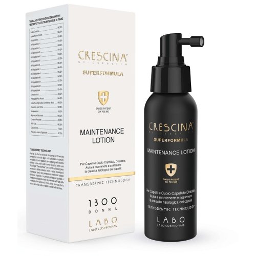 CRESCINA MAINTENANCE LOTION è una lozione spray che contiene tutte le componentiattive del trattamento in fiale, in dosaggio ottimizzato per consentire il protocollopiù adeguato idoneo a fornire continuativamente ai bulbi e ai follicoli piliferisia singoli che appartenenti alle isole follicolari, le sostanze nutritive ed energetichedi cui hanno bisogno per mantenere e consolidare i risultati ottenuti. aiuta afortificare i capelli in fase anagen e sostenere il naturale processo di crescita deicapelli. CRESCINA MAINTENANCE LOTION è adatta all'utilizzo come proseguimento dopoil ciclo di due mesi di crescina in fiale, oppure come trattamento di mantenimento daapplicare in qualsiasi momento e/o al bisogno. lndicata nei casi di diradamentodipendente da cause fisiologiche e non patologiche. Non agisce sui follicolicompletamente atrofizzati. La formula, più delicata e leggera rispetto allaformula in fiale, contiene il complesso ri-crescita (cisteina, lisina, glicoproteina)associato al nuovo componente potassium azeloyl diglycinate specifico per il diradamentoprogressivo, il complesso isole follicolari, il complesso HFSC (stem-engine) e ilcomplesso hair booster 177, il complesso Neo-MITO - mitochondria (nonapeptide-1,magnesium gluconate, carnitine fumarate più SOD- like e calcium PCA) e 12 molecoleplate-like di sintesi simili alle molecole peptidiche endogene presenti naturalmente nelsistema pilifero. Sul microbioma del cuoio capelluto agisce lo scalp microbiome complex(sarcosine e Pseudoalteromonas ferment extract) per mantenerlo in condizioni ottimali.Contiene inoltre resveratrolo, fitoestrogeno di origine naturale, ad attivitàprotettiva sui follicoli dei capelli femminili.