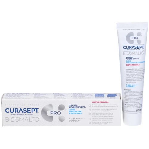 Curasept Biosmalto Mousse Azione D’Urto alla Fragola è una mousse dentale ad azione intensiva, formulata per proseguire il trattamento professionale effettuato in studio dentistico. È particolarmente indicata per i pazienti con alto rischio di carie, erosioni dello smalto e abrasioni dentali, grazie alla sua formula rinforzata. La mousse contiene F-ACP Complex, una combinazione di fluoruro, calcio e fosfati che favorisce la remineralizzazione profonda dello smalto e della dentina, rendendo le strutture dentali più resistenti agli attacchi acidi e all'usura meccanica. Il gusto fragola la rende gradevole e ben tollerata, ideale anche per adolescenti e pazienti che preferiscono aromi dolci e delicati. Va sempre utilizzata in abbinamento a un dentifricio della linea Biosmalto Carie Abrasione & Erosione, per un’efficacia potenziata nel tempo.