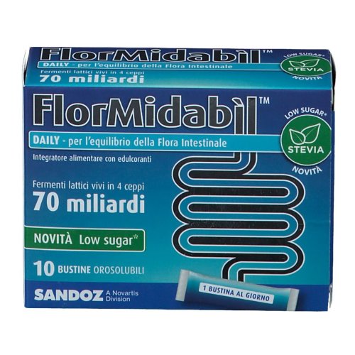 Flormidabil Daily di Sandoz è un integratore alimentare in bustine a base di fermenti lattici vivi (probiotici), ideato per favorire il benessere della flora intestinale. Senza glutine, senza lattosio, senza OGM, adatto anche a vegani e vegetariani. La nuova formulazione è low sugar (90% di zuccheri in meno) e dolcificata con Stevia. È indicato in caso di: