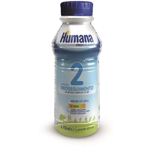 Humana 2 Bottiglia 5 HMO 470ml è un latte di proseguimento studiato per i lattanti dal 6° mese compiuto fino al 12° mese di vita. È indicato come complemento e integrazione di una dieta varia e bilanciata, e non deve essere utilizzato come sostituto del latte materno nei primi sei mesi. Contiene importanti nutrienti come vitamine A, C, D, zinco, ferro, iodio, calcio e DHA che contribuiscono al normale funzionamento del sistema immunitario, allo sviluppo cognitivo, cerebrale, visivo, osseo e dentale del bambino. La presenza di 5 HMO (oligosaccaridi del latte umano) aiuta a supportare il sistema immunitario e la salute intestinale del lattante. L’inizio dello svezzamento deve avvenire sempre seguendo le indicazioni del pediatra.