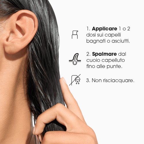Applicare 1-2 erogazioni di siero sui capelli bagnati o asciutti, distribuendo il prodotto uniformemente. Non è necessario risciacquare.