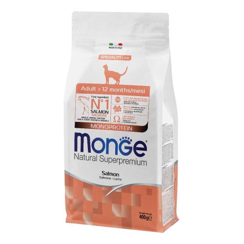 Alimento completo e bilanciato per gatti adulti. Prodotto formulato con un'unica fonte proteica animale, il salmone è il primo ingrediente e con l'inclusione di pesce fresco per una digeribilità e appetibilità ottimale. La formulazione è arricchita con XOS (Xilo-oligosaccaridi), prebiotici di ultima generazione che supportano il benessere intestinale. L'inclusione di ingredienti ricercati, come la rosa canina con componenti antiossidanti per poter contribuire a neutralizzare i radicali liberi e la yucca schidigera per il controllo degli odori intestinali, è frutto della ricerca Made in Italy per supportare la qualità di vita dei nostri gatti. Formulazione con acidi grassi Omega-3 per la lucentezza del pelo.