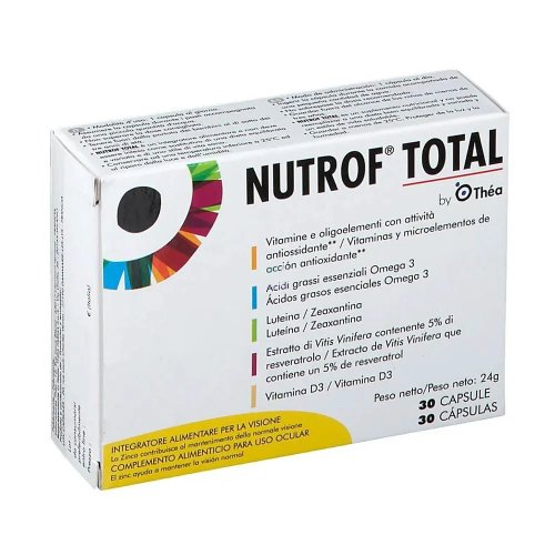 Théa Nutrof Total è un integratore alimentare completo formulato per supportare il benessere e la funzione visiva. Contiene zinco, che contribuisce al mantenimento della normale visione, ed è arricchito con acidi grassi essenziali Omega 3, luteina e zeaxantina, nutrienti fondamentali per la salute degli occhi. La sua formulazione avanzata include inoltre vitamine C, E e D3, selenio, rame, glutatione ed estratto di Vitis vinifera standardizzato in resveratrolo, sostanze che contribuiscono alla protezione delle cellule dallo stress ossidativo e al normale funzionamento dell’apparato visivo. Nutrof Total è indicato in caso di aumentato fabbisogno nutrizionale o ridotto apporto di micronutrienti utili alla vista.