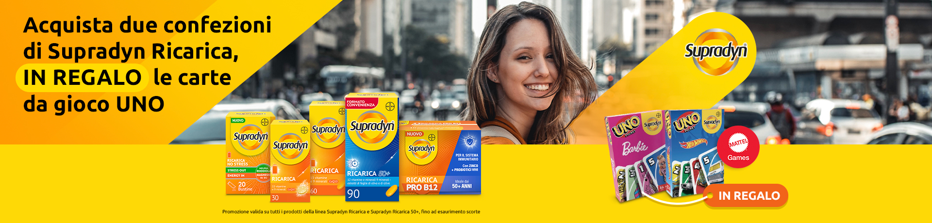 Acquista due confezioni di Supradyn Ricarica, per te in regalo una confezione di carte da gioco Mattel!