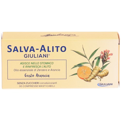 Giuliani Salva Alito Rimedio Alito Cattivo Gusto Arancia è un integratore alimentare in compresse masticabili studiato per contrastare efficacemente l’alito cattivo agendo direttamente nello stomaco, eliminando il problema alla radice. La sua formula è a base di essenze naturali selezionate come ginger, ginepro e mentolo, che favoriscono la digestione e hanno proprietà antifermentative per ridurre la formazione di odori sgradevoli. Grazie al gradevole aroma di arancia, unito al fresco gusto del mentolo, le compresse donano una sensazione di freschezza e pulizia nel cavo orale. Senza zuccheri, sono indicate anche per diabetici e per chi segue diete ipocaloriche. La linea Salva Alito rappresenta un rimedio naturale e affidabile per chi soffre di alitosi, spesso legata a problematiche digestive e non solo a scarsa igiene orale.