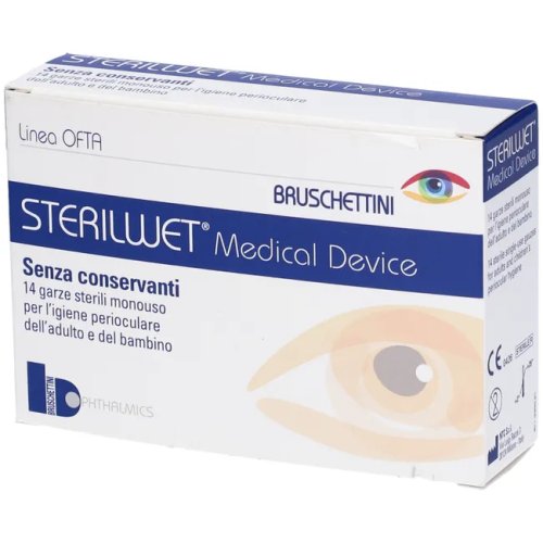 Sterilwet Garza Oftalmica di Bruschettini è un dispositivo medico CE di classe IIa composto da garze sterili monouso in cotone 100%, imbevute di una soluzione a base di estratti vegetali (Camomilla Recutita, Euphrasia Officinalis) e acido ialuronico, formulata per offrire una detersione delicata e allo stesso tempo lenitiva, idratante, decongestionante e protettiva. Indicate per adulti e bambini, le garze Sterilwet sono ideali per l’igiene oculare quotidiana, anche in caso di infezioni, infiammazioni, allergie, secrezioni oculari o nel pre e post-chirurgia oftalmica. Grazie all'azione combinata degli ingredienti attivi, queste garze sono perfette per calmare irritazioni oculari, proteggere la zona perioculare e facilitare il processo di riepitelizzazione della cornea dopo stress ambientali come smog, vento, polvere o esposizione a schermi digitali.