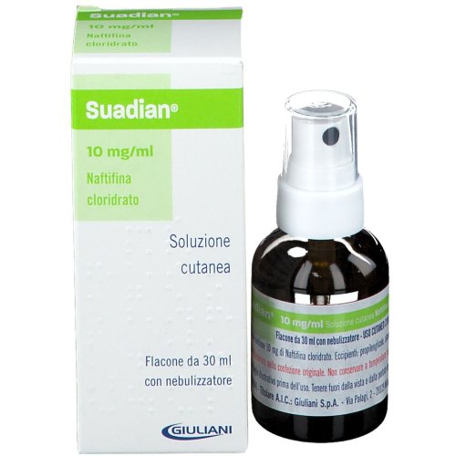 SUADIAN 10 mg/ml soluzione cutanea con nebulizzatore è un antimicotico topico indicato per il trattamento di infezioni micotiche della cute e delle unghie (dermatomicosi e onicomicosi) causate da dermatofiti, lieviti o muffe.Grazie alla formulazione in spray, Suadian consente un'applicazione mirata, igienica e uniforme, ideale soprattutto su superfici cutanee estese, aree pilifere o zone difficili da trattare, come il cuoio capelluto. Indicata anche come trattamento nelle pieghe cutanee (inguinali, sottomammarie, intertriginose) dove l'umidità può favorire le infezioni fungine. Utilizzabile in combinazione con garze protettive per un'applicazione notturna.