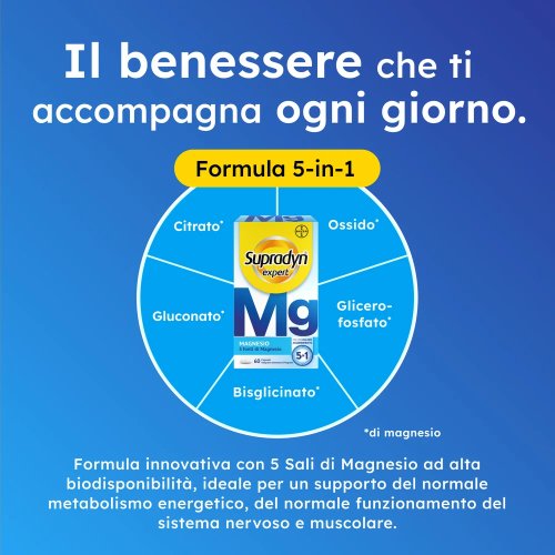 SUPRADYN EXPERT MAGNESIO COMPLETO è un integratore alimentare avanzato formulato per supportare il normale funzionamento dei muscoli e del sistema nervoso e contribuire alla riduzione di stanchezza e affaticamento. È ideale per chi conduce una vita attiva, affronta periodi di stress fisico o mentale o desidera migliorare la concentrazione e la vitalità muscolare quotidiana. La sua formula esclusiva contiene 5 sali di Magnesio ad alta biodisponibilità – bisglicinato, citrato, ossido, gluconato e glicerofosfato – studiati per garantire un assorbimento ottimale e un apporto elevato di magnesio. Un supporto completo per energia, benessere neuromuscolare ed equilibrio elettrolitico. Indicato per adulti, Supradyn Expert Magnesio Completo rappresenta una soluzione efficace e pratica per integrare il fabbisogno giornaliero di magnesio.