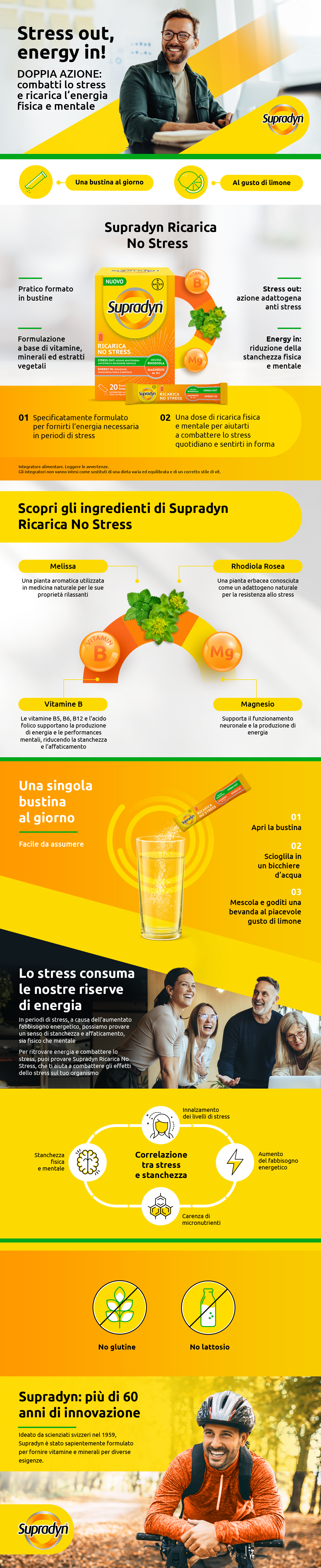 Supradyn Ricarica No Stress è un integratore alimentare completo, studiato per supportare il tuo corpo e la tua mente nei momenti di stress e affaticamento. Grazie alla sua formulazione con vitamine del gruppo B, magnesio, estratti di rodiola e melissa, contribuisce a: