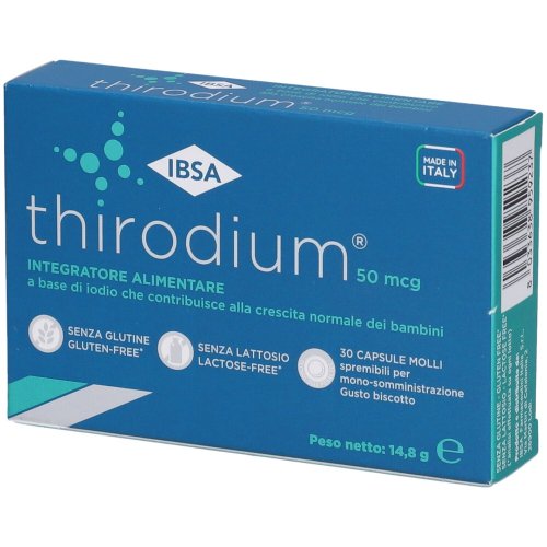 IBSA Thirodium Bambini 30 capsule molli è un integratore alimentare specificamente formulato per supportare la funzione tiroidea e lo sviluppo cognitivo nei bambini. Contiene iodio, un minerale essenziale per la crescita e lo sviluppo neurologico in età pediatrica. In comode capsule molli spremibili, dal gusto biscotto, è ideale per l’assunzione quotidiana anche nei più piccoli. La sua formula è senza glutine e naturalmente priva di lattosio, pensata per garantire massima tollerabilità.