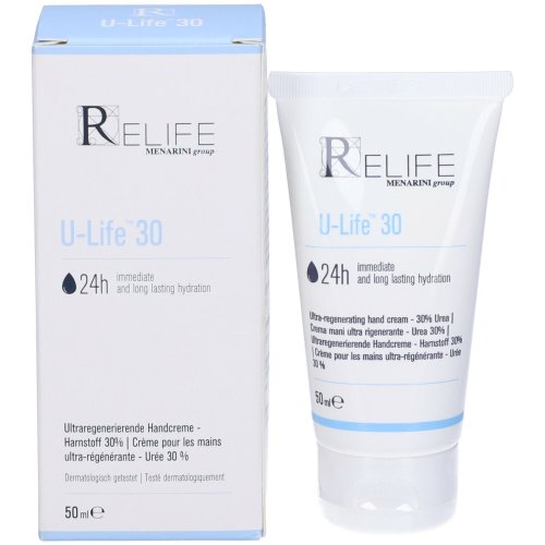 RELIFE U-Life 30 è una crema idratante e cheratolitica appartenente alla linea U-Life di Relife, studiata per il trattamento mirato della pelle secca, molto secca, ruvida e screpolata. La formula è specificamente indicata per le zone del corpo soggette a forte disidratazione e ispessimento cutaneo, come mani, gomiti, piedi e aree esposte ad agenti esterni. Grazie all’elevata concentrazione di urea al 30%, Relife U-Life 30 svolge un’azione intensiva idratante, esfoliante e rigenerante, favorendo il ripristino della barriera cutanea e migliorando l’elasticità della pelle. È particolarmente indicata come crema mani ultra rigenerante, ideale in caso di secchezza severa, screpolature e ispessimenti localizzati. La texture è studiata per garantire un rapido assorbimento senza ungere. La formulazione è priva di parabeni e fragranze, rendendola adatta anche alle pelli sensibili e reattive.