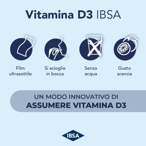 IBSA Vitamina D3 1000 UI è un integratore alimentare orodispersibile in formato film, utile per sostenere la funzione del sistema immunitario, favorire l’assorbimento di calcio e fosforo e contribuire alla salute di ossa e denti. Grazie alla tecnologia brevettata Film Tec®, il film si scioglie rapidamente in bocca senza bisogno d’acqua, risultando pratico e veloce da assumere ovunque. Il gusto all’arancia lo rende gradevole anche per chi ha difficoltà con le classiche compresse. La Vitamina D3 (colecalciferolo) è essenziale in caso di carenza da scarsa esposizione al sole, età avanzata, dieta inadeguata o menopausa.